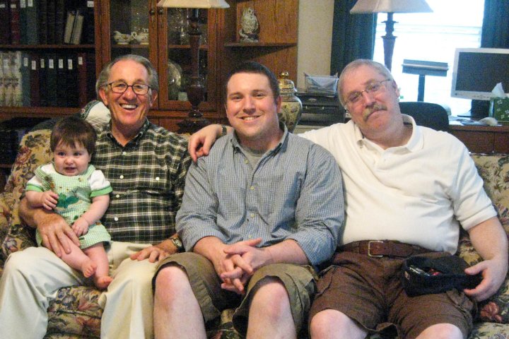 He’s the “old” man in the picture–holding his great-grandson (David Lee) and sitting with his grandson (Lee) and me.