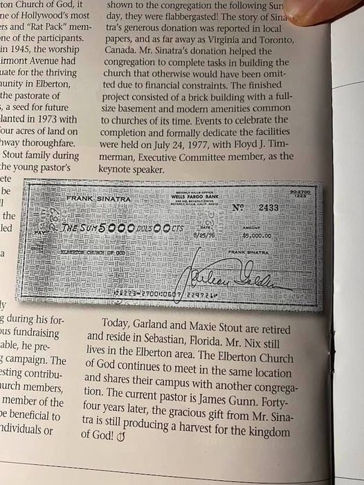 There’s the neatest story in the November/December addition of the Evengel. It recounts how a member of the Elberton Church of God sent out requests for assistance towards a building project for his church. He sent it to everyone he could think of–including Frank Sinatra–who sent a check for 5000.00 (23,000 in today’s dollars). Pretty neat huh?